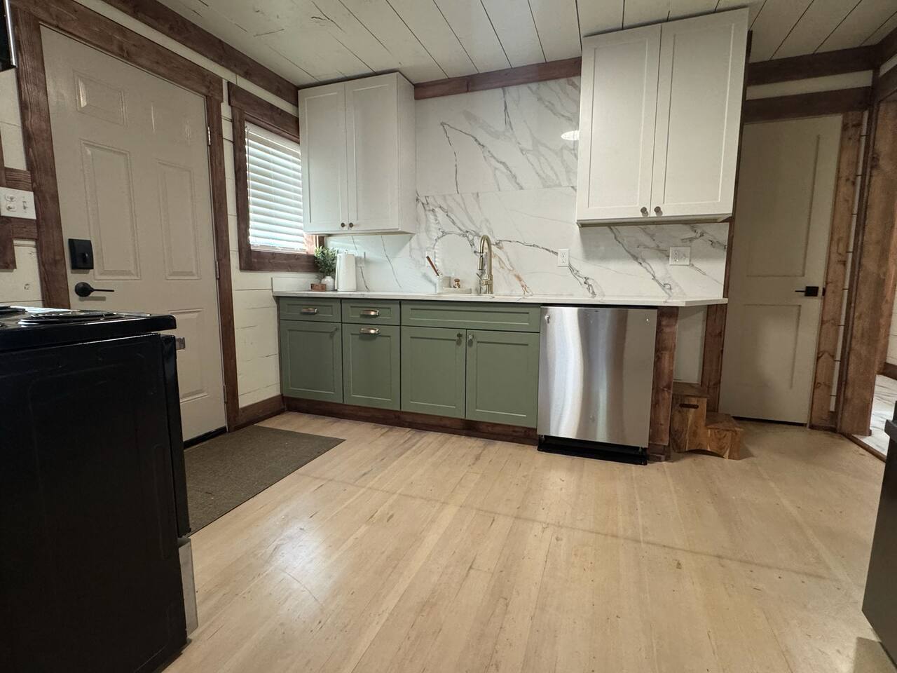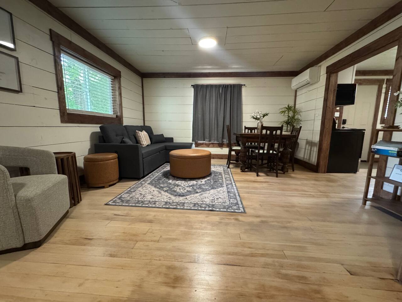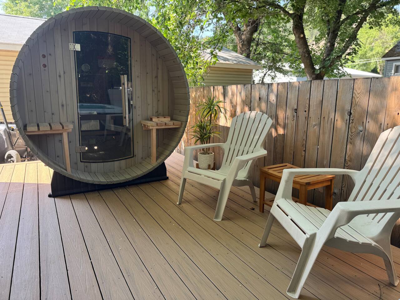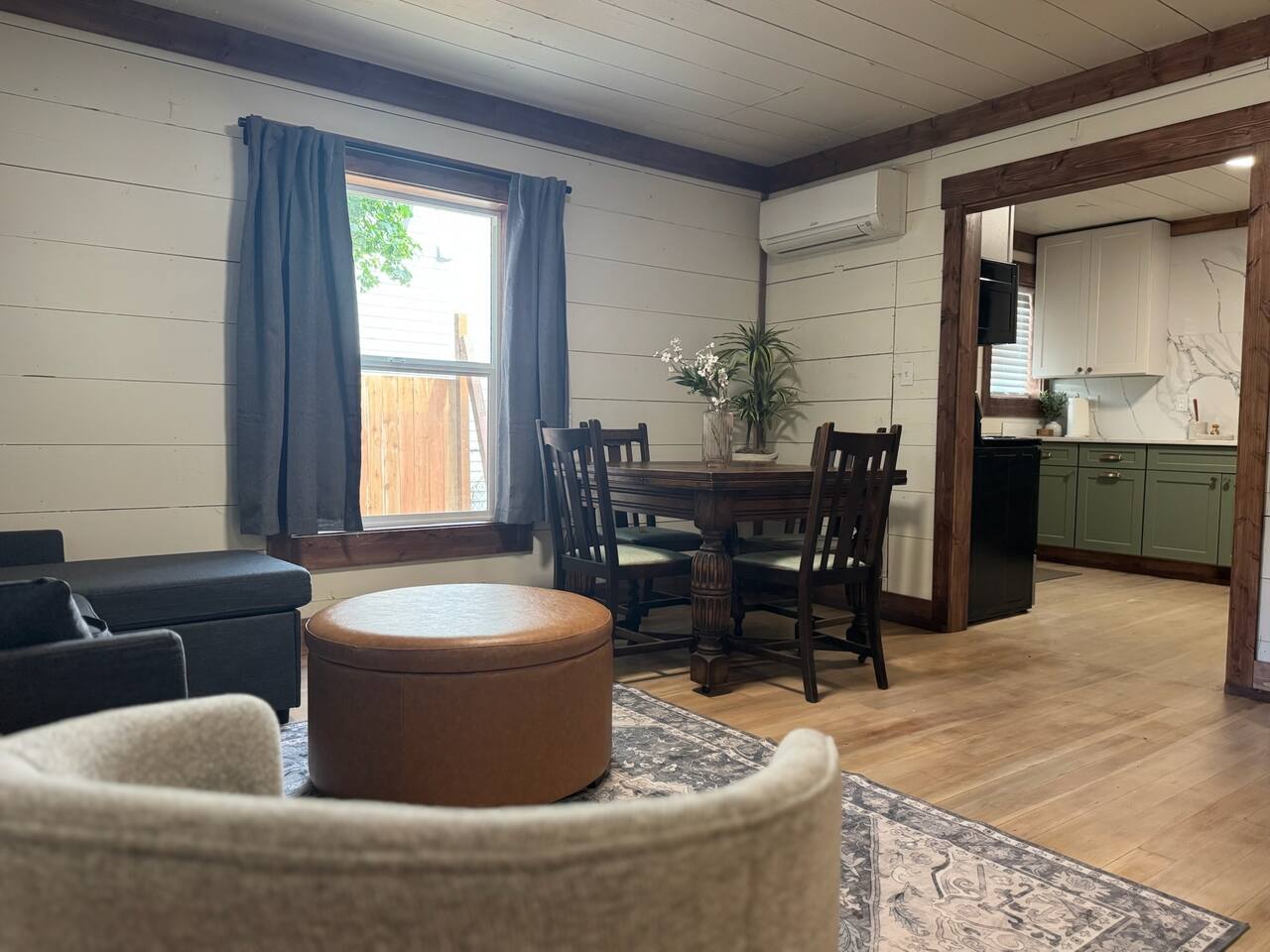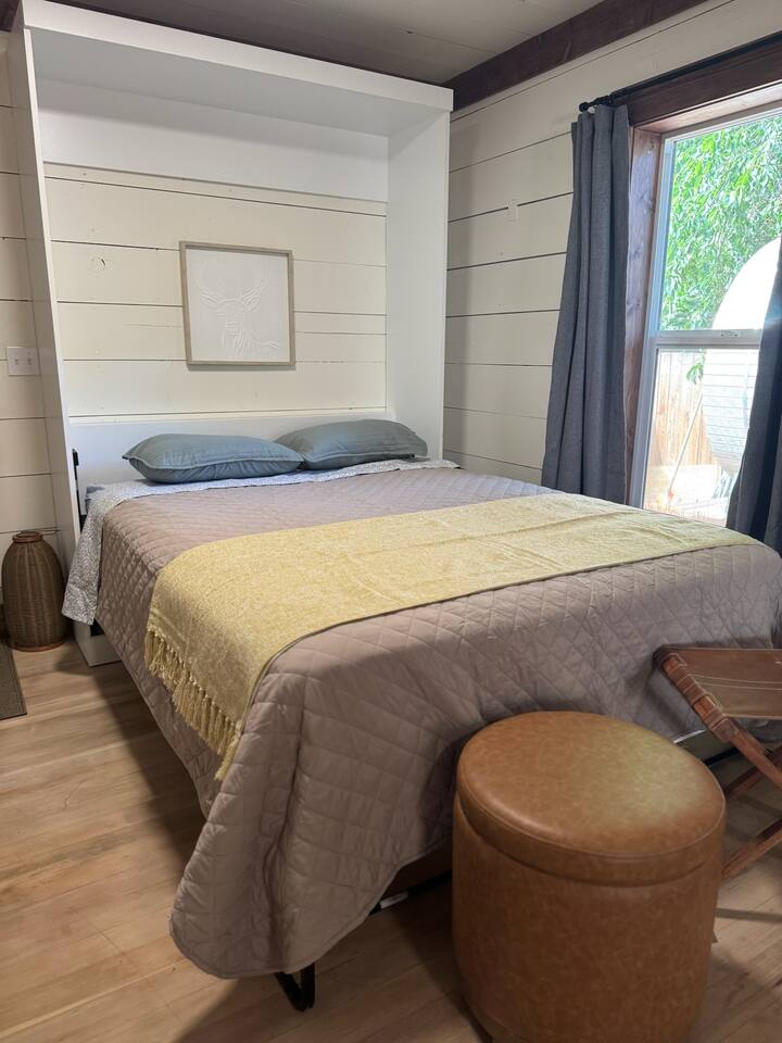 This property offers a private one bedroom with a queen bed, a full bathroom with walk-in shower and towel warmer, a full kitchen, an additional bedroom space in the studio living area, and a living/dining room space with a small convertible couch. On the back patio, you will find a 4-6 person cedar barrel sauna and a 6 person hot tub to soak away your day, adventuring, and recuperate for tomorrow! This property is available in conjunction with the yellow house next-door, which sleeps up to 10 people, if you would like to book them together to stay near family or friends in order to share your adventuring memories together. Each location has its own private hot tub.